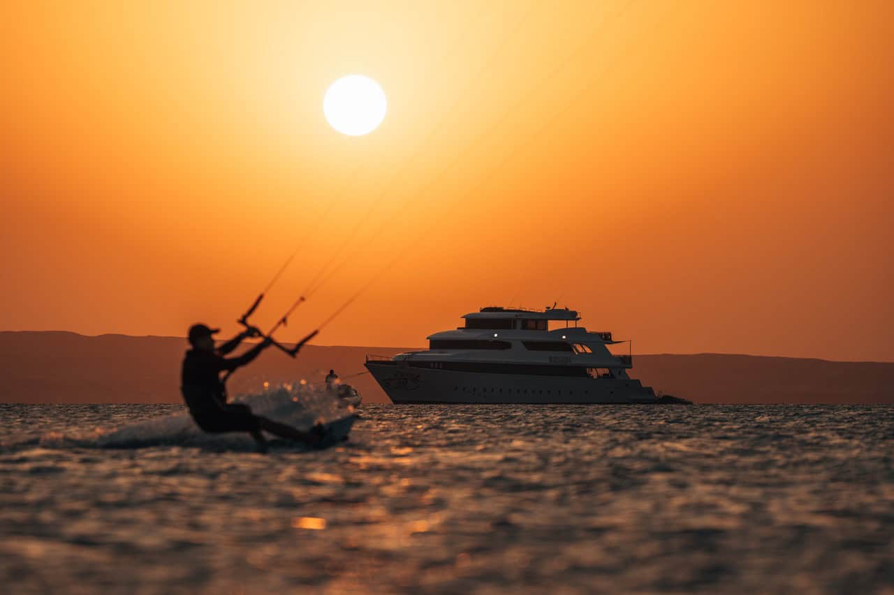 We eindigen met kiten rond het middaguur en genieten van een stevige lunch voordat we teruggaan naar Hurghuda.We moeten namelijk voor sunset weer terug in de haven zijn. De kite spullen worden in de jachthaven schoongemaakt en verpakt. Heb je nog energie voor meer plezier? In de avond gaan we uit in één van de populairste strandnachtclubs in de omgeving. We slapen er een laatste nacht op de boot in de jachthaven.